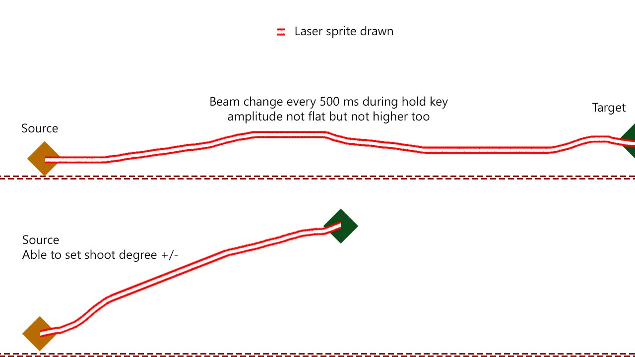 Donc l'idée c'est de pouvoir orienter l'angle du tir "émetteur/source" dans un range entre -45 et 45° par exemple, et lorsque qu'on maintient appuyé sur la touche "tir" une ligne légèrement brisée (de faible amplitude) se dessine tous les 1/2 secondes composé le laser est créé par une succession d'actifs à chaque fois...