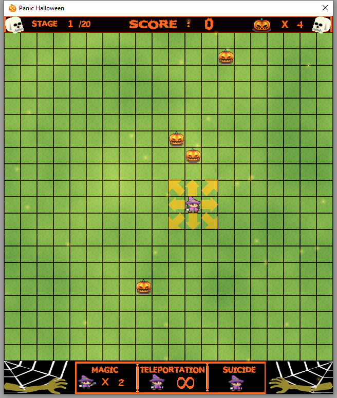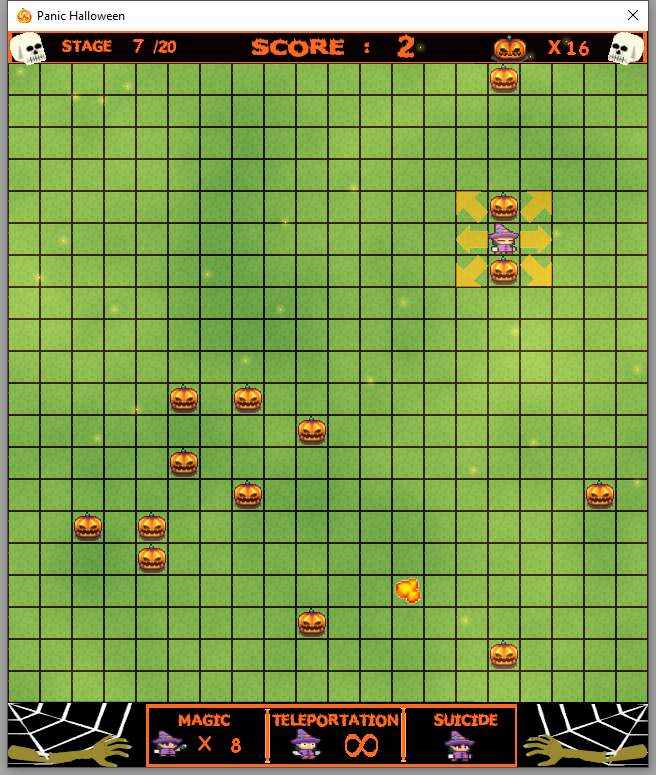 Magica ne faisait pas attention et se dirigea droit vers le terrain des citrouilles. Ils ne sont pas très intelligents. Ils courront aveuglément vers Magica - parfois écrasés l'un contre l'autre ou trébuchant sur la bouillie de citrouille. Cliquez sur les flèches pour vous déplacer, cliquez sur Magica pour reste sur place faire avance les citrouilles. Cliquez bouton pour utilise la MAGIE quand les citrouilles sont les plus proches ou utils le bouton TELEPORTATION vous amener vers un endroit aléatoire. Vous pouvez également utilise le bouton SUICIDE pour faire votre dernier combat ou attirer les citrouilles sur leur bouillie.