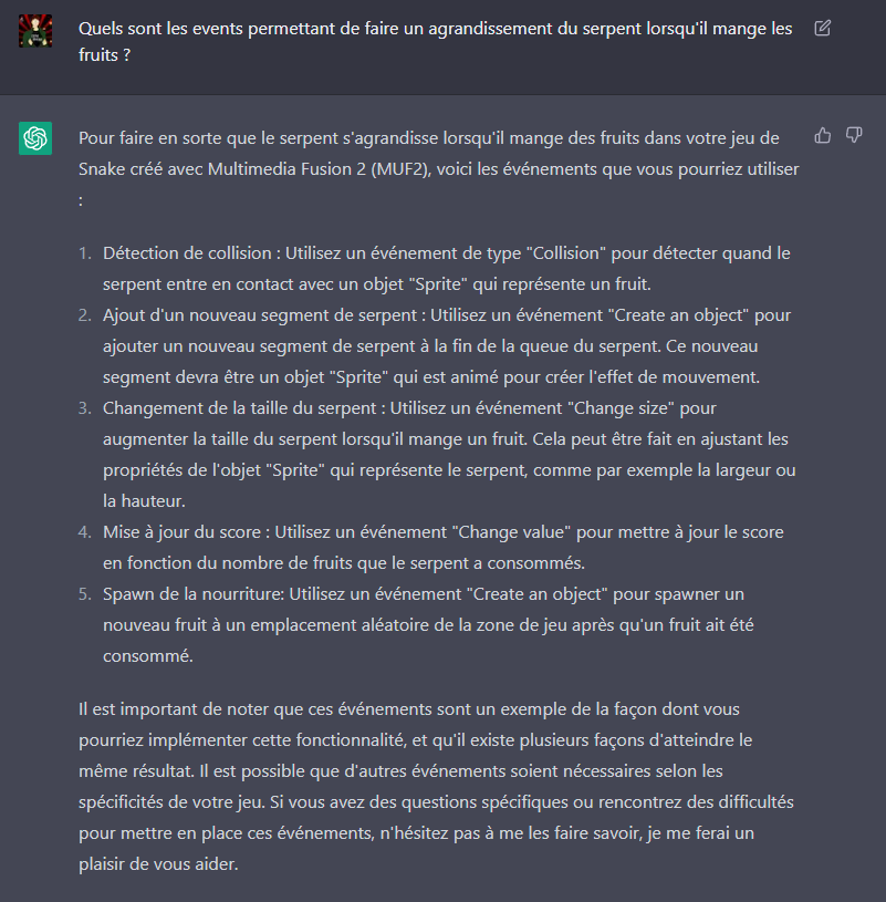 J'ai essayé pour la première fois le Chat GPT en posant des questions sur la création de jeu avec Fusion 2.5.