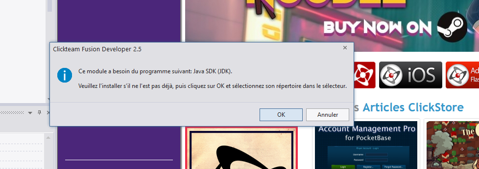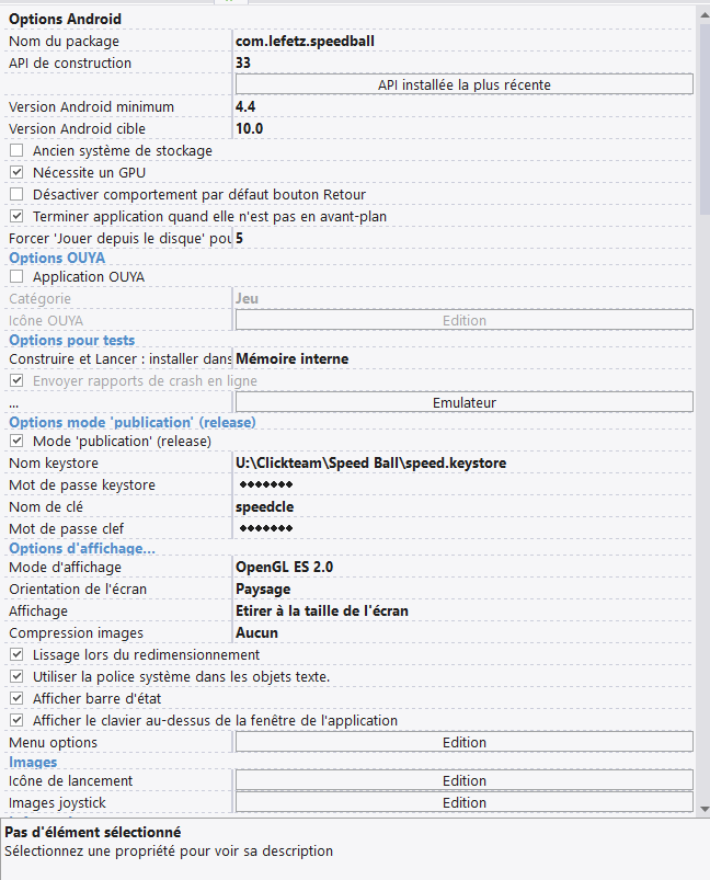 Emmanuel, je viens de faire ce que tu m'as dit. Effectivement la variable était restée un emplacement erroné. Et devine quoi..... ? ? ? Ca marche ! ! ! Alors un grand merci ! ! ! Fusion construit mon jeu en API 34. Enfin presque... Car au moment dans l'importer dans Google, il me dit que c'est en API 29 ! Alors que j'ai essayé 31 et 34 et à chaque fois, Google m'écris qu'il est en 29 !