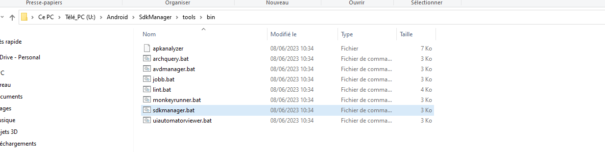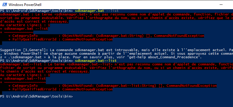 dans le répertoire (tool\bin) du a bien le fichier sdkmanager.bat pour lance le cmd du fait clique droit en maintenant la touche Maj sur le dossier bin puis choisissez "Ouvrir la fenêtre PowerShell ici"