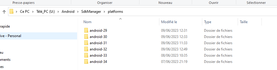 Pour le SdkManager, comme tu me l'as indiqué, j'ai pu voir mes API installées dans le répertoire "platforms". Les API installés vont de 29 à 34.