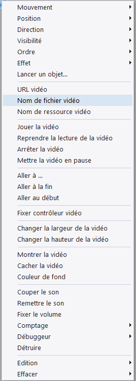 2. J'ai créé un évènement pour jouer la vidéo dès l'ouverture de la scène. J'ai essayé de charger la vidéo avec "nom de fichier vidéo" et comme ça ne marchait pas, j'ai essayé avec "nom de ressource vidéo".