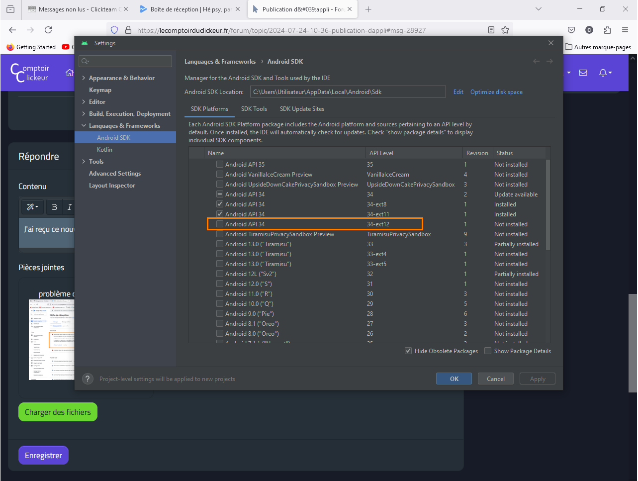 J'ai reçu ce nouveau message , voir l'image. Peux-être installer l'API 34 ext. 12 ?