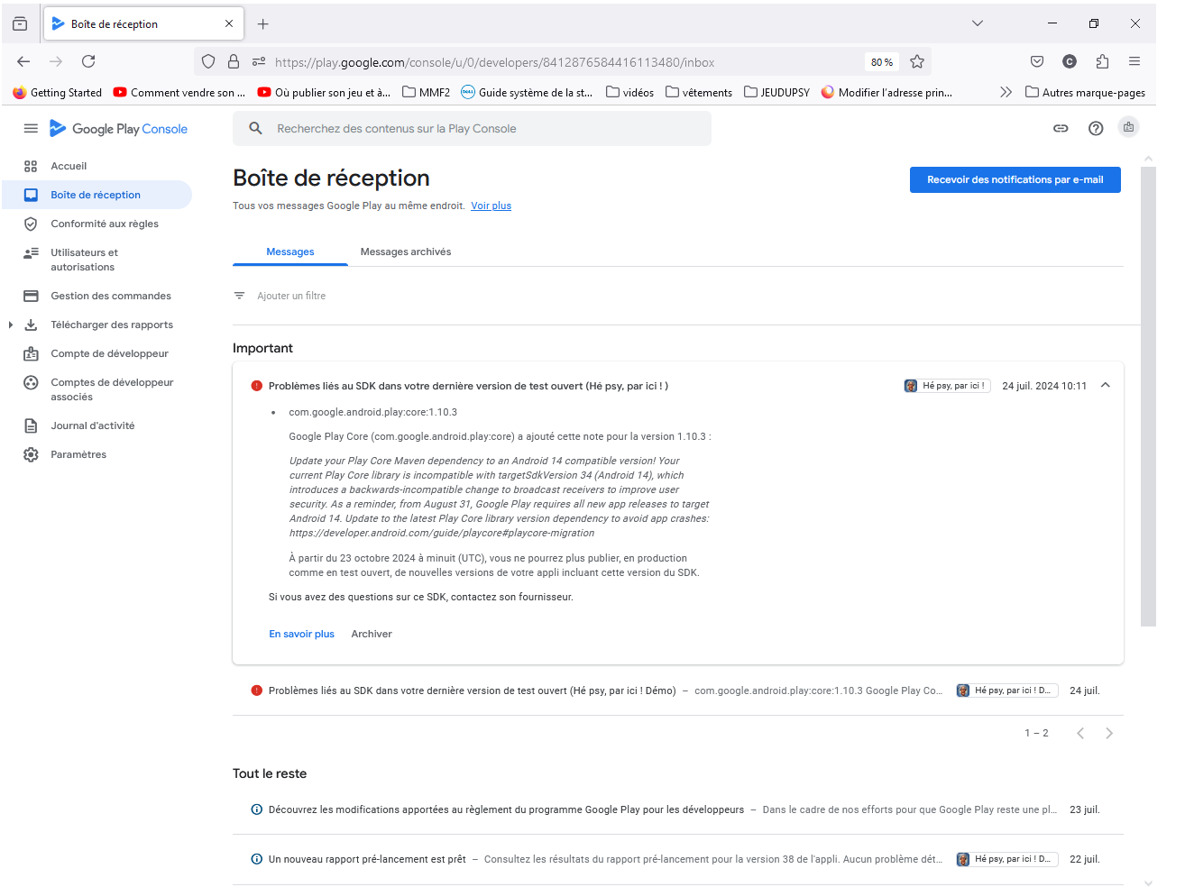 Je ne comprends pas, j'ai fait la dernière mise à jour, elle s'est bien installer. Puis j'ai mis API de construction 34 et version cible 14.0 la console google play me met toujours cet avertissement :