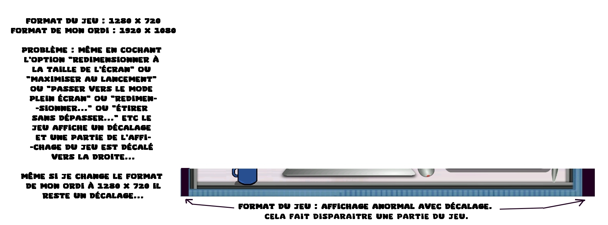 Je comprends ton raisonnement est logique, le fait que la taille augmente les pixels, cependant, quand je lance mon jeu en plein écran (en cochant "changer la résolution" il apparaît avec la bonne qualité graphique et le jeu prend pourtant quasi tout l'écran mais ça apparaît juste comme décalé, disons on ne voit pas une partie du contour sur la gauche (bien regarder la photo que j'ai pris avec mon tel, à droite on voit la bordure pas à gauche), on dirait donc juste un léger manque d'étirement de l'image du jeu seulement. Et c'est là où c'est impossible d'étirer, pour quelques cm...